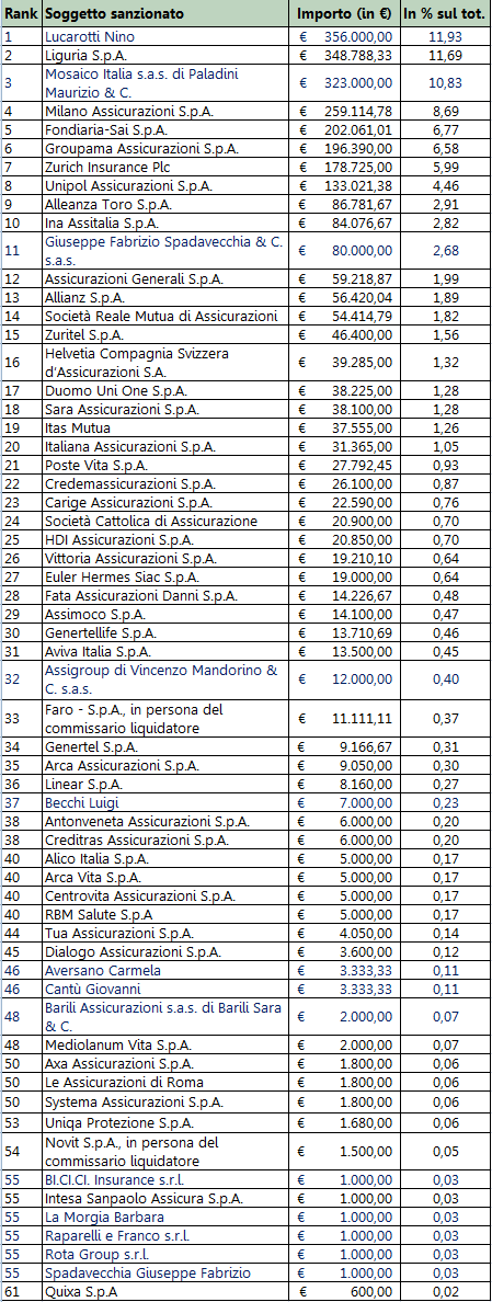 – Giuseppe Fabrizio Spadavecchia & C. s.a.s. € 80.000 per mancato rispetto dell’obbligo di separazione patrimoniale; mancato rispetto degli obblighi di informativa precontrattuale in n. 24 occasioni; mancato rispetto delle regole di diligenza, correttezza e trasparenza nei confronti degli assicurati in n. 55 occasioni.
