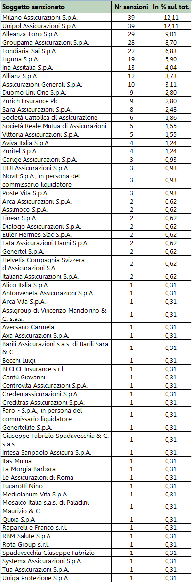 Segue Liguria Assicurazioni e nuovamente un intermediario. La classifica per numero di sanzioni è guidata ex aequo da Unipol e Milano.