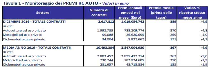 - Se si confronta la rilevazione puntuale del mese di dicembre 2012 con quella del dicembre 2016, il premio medio è sceso di 107 euro in valore assoluto (da 496 euro a 389 euro) e di quasi il 22% in termini percentuali.
