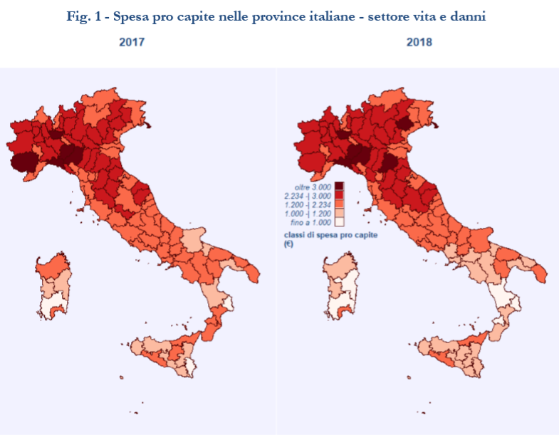 Nel 2018 le province con spesa pro capite superiore alla media nazionale (547 euro) sono 42: 35 nel Nord Italia (erano 38 del 2017) e 7 nel Centro (la raccolta complessiva del Centro Nord supera il 65% di quella nazionale); le 19 province con valori pro capite oltre 650 euro – prime tra tutte Milano, Genova, Treviso, Vercelli e Aosta – sono localizzate nel Nord Italia, ad eccezione di due province del Centro: Roma (705 euro) e Firenze (680 euro); le 16 province con spesa pro capite più bassa, fino a 300 euro, sono nel Sud e nelle Isole. La variabilità territoriale della spesa pro capite nel settore danni attorno al valore medio nazionale, sintetizzata dal CV, risulta inferiore e più stabile rispetto al settore vita.