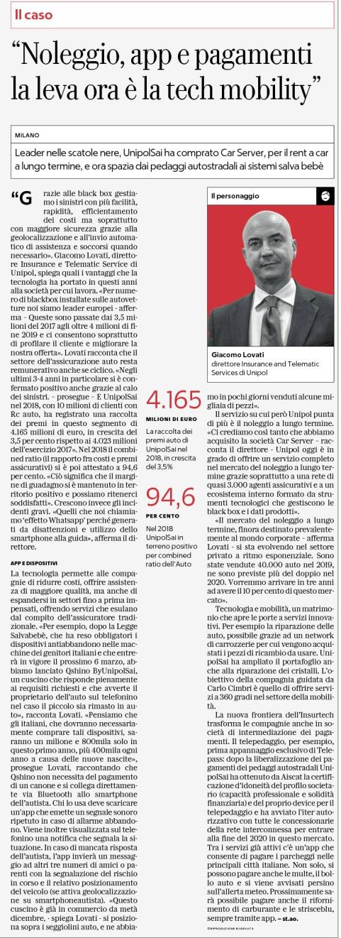 “Grazie alle black box gestiamo i sinistri con più facilità, rapidità, efficientamento dei costi ma soprattutto con maggiore sicurezza grazie alla geolocalizzazione e all’invio automatico di assistenza e soccorsi quando necessario. Giacomo Lavati, direttore Insurance e Telematic Service di Unipol, spiega quali i vantaggi che la tecnologia ha portato in questi anni alla società per cui lavora. «Per numero di black box installate sulle autovetture noi siamo leader europei – afferma – Queste sono passate dal 3.5 mi-lioni del 2017 agli oltre 4 milioni di fine 2019 e ci consentono soprattutto di profilare iI cliente e migliorare la nostra offerta».