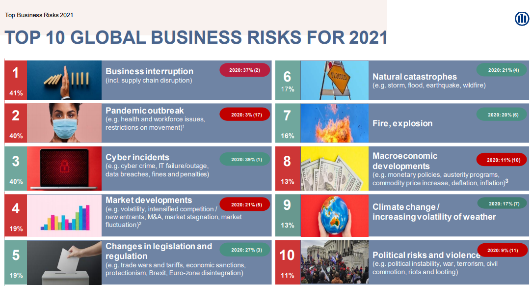 Un trio di rischi legati al Covid-19 guida il 10° Allianz Risk Barometer 2021, e riflette gli sconvolgimenti causati dai lockdown, misura adottata in molti nel mondo per arginare l’epidemia di coronavirus. L’interruzione di attività (n°1 con 41% delle risposte) e lo Scoppio della pandemia (n°2 con 40%) sono i principali rischi percepiti quest’anno, mentre i Rischi informatici (n°3 con 40%) si collocano al terzo posto.