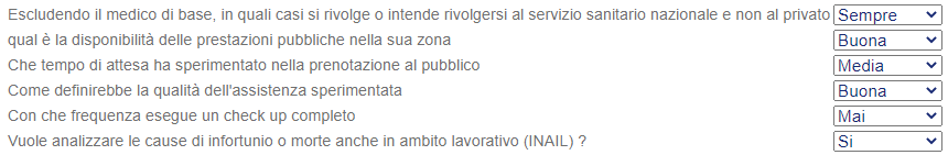 Le informazioni richieste definiscono il livello di fruibilità e qualità del Servizio Sanitario Nazionale della propria zona di residenza. Tanto più il servizio sanitario nazionale della propria zona di residenza funziona in maniera non adeguata, tanto maggiore risulterà il fabbisogno di copertura, su cui potranno essere ponderate alternative di assistenza privata.