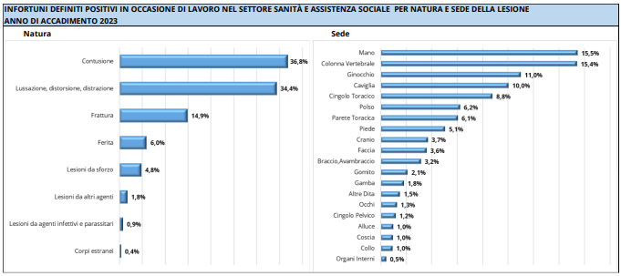 Le professioni in prima linea sono anche le più coinvolte negli infortuni sul lavoro: tre incidenti su 10 interessano infermieri e ostetriche, uno su quattro professionisti qualificati nei servizi sanitari e sociali come operatori sociosanitari, assistenti alla poltrona e puericultrici, seguiti a distanza da addetti all’assistenza personale, ausiliari, personale addetto alla riabilitazione e autisti, compresi i conduttori di ambulanza. Il 48,3% degli infortunati ha più di 49 anni.