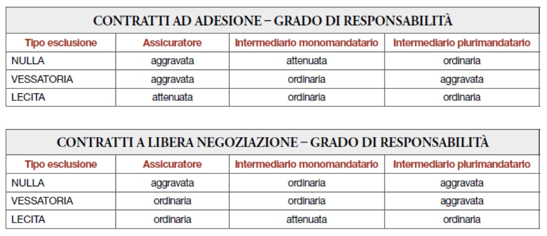 Nelle tabelle seguenti si ipotizza la responsabilità, ricadente su assicuratori e intermediari da violazione della compliance, proveniente da clausole nulle, vessatorie, o lecite presenti nel contratto, in relazione alle norme sulla trasparenza della nota informativa e sull’adeguatezza dei contratti.