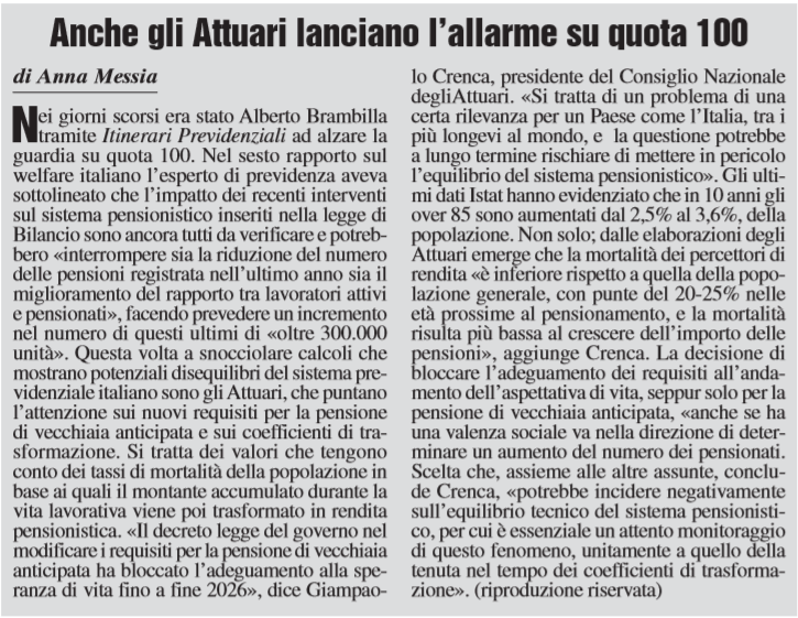 Nei giorni scorsi era stato Alberto Brambilla tramite Itinerari Previdenziali ad alzare la guardia su quota 100. Questa volta a snocciolare calcoli che mostrano potenziali disequilibri del sistema previdenziale italiano sono gli Attuari, che puntano l’attenzione sui nuovi requisiti per la pensione di vecchiaia anticipata e sui coefficienti di trasformazione.