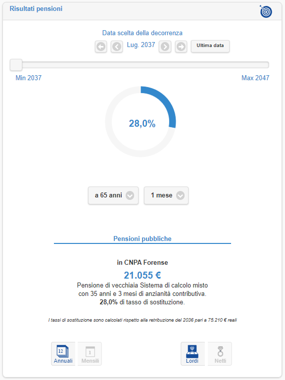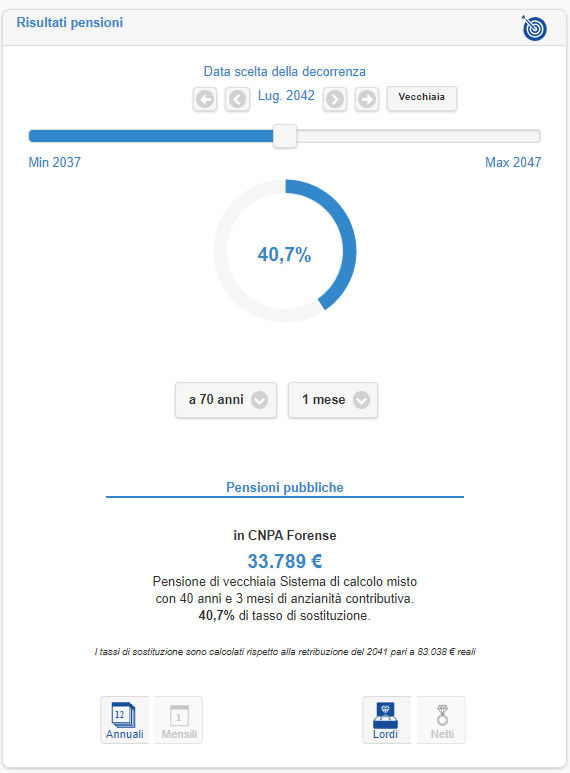 Il reddito dell’Avvocato è comunque importante e prevede crescerà del 2% l’anno oltre l’inflazione. Sulla base dei dati inseriti, Mario non potrà andare in pensione prima del 2037 al compimento del 65esimo anno di età quando avrà maturato un’anzianità contributiva di 35 anni.