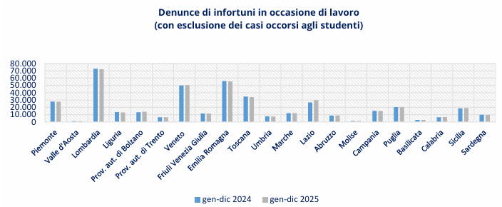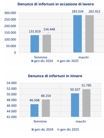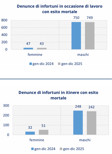 La diminuzione rilevata nel confronto dei periodi gennaio-dicembre 2024 e 2025 è legata sia alla componente maschile, le cui denunce mortali in occasione di lavoro sono passate da 750 a 749, sia a quella femminile (da 47 a 43). Aumentano le denunce dei lavoratori stranieri (da 176 a 182), in riduzione quelle degli italiani (da 621 a 610).