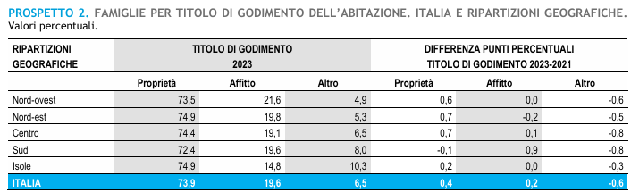Il 73,9% delle famiglie vive in case di proprietà, il 19,6% in affitto e il 6,5% in abitazioni occupate ad altro titolo (uso gratuito o altre forme).