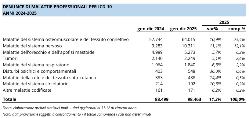Guardando alla classificazione Icd-10, si conferma anche nel 2025 la prevalenza delle patologie a carico dell’apparato osteomuscolare e del tessuto connettivo, da anni il gruppo più frequentemente denunciato. I casi rilevati sono 64.015 (al netto delle denunce non definite), pari al 75,4% del totale, con un incremento del 10,9% rispetto ai 57.744 del 2024. Al secondo posto si collocano le malattie del sistema nervoso, che con 10.311 denunce rappresentano il 12,1% dei casi determinati e crescono dell’11,1% rispetto alle 9.283 dell’anno precedente. Seguono le patologie dell’orecchio e dell’apofisi mastoide, arrivate a 5.273 casi, in aumento del 5,7% rispetto ai 4.989 del 2024 e con un peso complessivo pari al 6,2%.