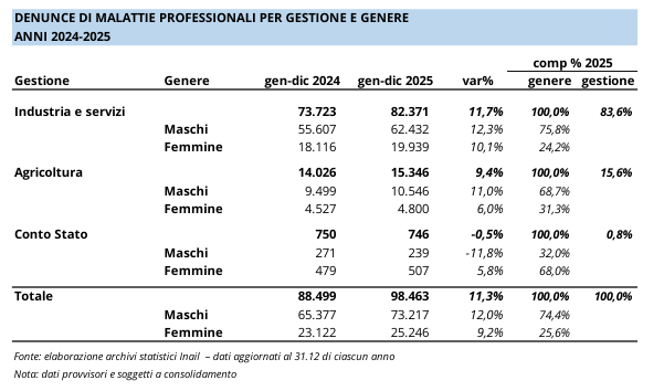 Dal punto di vista delle gestioni assicurative, è l’Industria e servizi a concentrare la quota più elevata di casi. In questo comparto, nel 2025 sono state registrate 82.371 denunce, pari all’83,6% del totale, con una crescita dell’11,7% rispetto alle 73.723 malattie professionali del 2024. Molto più contenuto, ma comunque in aumento, il numero dei casi in Agricoltura: 15.346 denunce, che rappresentano il 15,6% del totale, in crescita del 9,4% rispetto alle 14.026 dell’anno precedente. In controtendenza, seppure in misura lieve, il Conto Stato, che con 746 denunce e un’incidenza dello 0,8% sul complesso fa segnare una diminuzione dello 0,5% rispetto alle 750 del 2024.