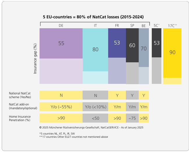 Il documento parte da un dato di fatto: in Europa il cat nat protection gap (la quota di danni da catastrofi naturali non coperta da assicurazione) resta intorno al 65%, pur in presenza di perdite economiche in forte crescita (+250% circa negli ultimi decenni) a causa di urbanizzazione, aumento dei valori esposti, inflazione dei costi e intensificazione degli eventi estremi. Il vero problema non è – secondo il RAB – l’offerta di coperture, ma la domanda insufficiente e, in parte, l’accessibilità per alcuni assicurati.