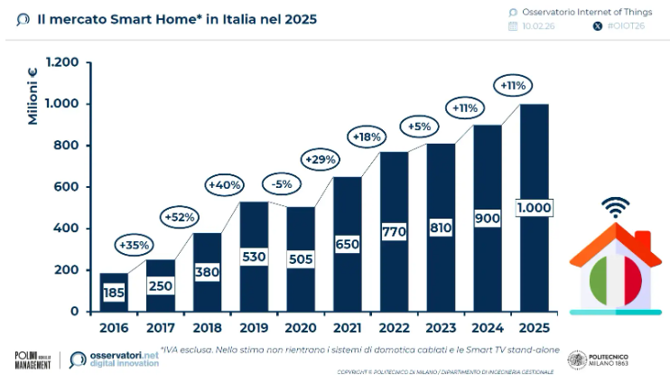Il mercato italiano della smart home ha superato per la prima volta la soglia del miliardo di euro nel 2025, mettendo a segno una crescita dell’11% rispetto al 2024 e allineandosi ai principali mercati europei per ritmo di sviluppo, pur restando indietro in termini di spesa pro capite. A trainare il settore sono soprattutto le soluzioni per la sicurezza – videocamere, sensori, serrature e videocitofoni connessi – che da sole valgono circa 305 milioni di euro, pari al 30% del mercato, affiancate da elettrodomestici smart e dispositivi per l’efficienza energetica.