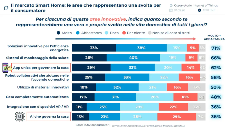 Per i consumatori, le innovazioni che sarebbero una svolta nella vita quotidiana sono soprattutto le soluzioni per massimizzare l’efficienza energetica (71%), seguite a breve distanza dai sistemi di monitoraggio per la salute (66%): per entrambe vedono con chiarezza il valore generato. Al terzo posto si posiziona la possibilità di avere un’unica App che permetta di governare l’intera abitazione (62%): un segnale importante che conferma la necessità di rendere interoperabili gli oggetti in casa.