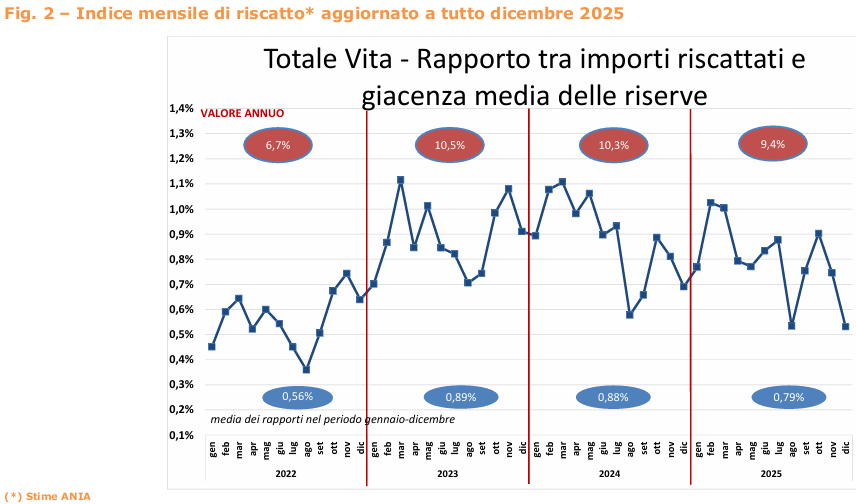 Le uscite continuano a essere dominate dai riscatti e altri rimborsi, che rappresentano il 76% dei pagamenti complessivi (82,2 miliardi) ma risultano in calo del 6,6% sull’anno precedente; i sinistri per decesso e altri eventi vitalizi restano su livelli elevati (15,3 miliardi, il 14% delle uscite), ma leggermente inferiori al 2024, mentre scadenze e rendite maturate salgono a 11,2 miliardi (+6,2%), pari al 10% delle uscite. L’indice annuo di riscatto, misurato rispetto alle riserve matematiche, scende dal 10,3% al 9,4%, con una dinamica mensile ancora altalenante ma un dato di dicembre contenuto (0,5%).