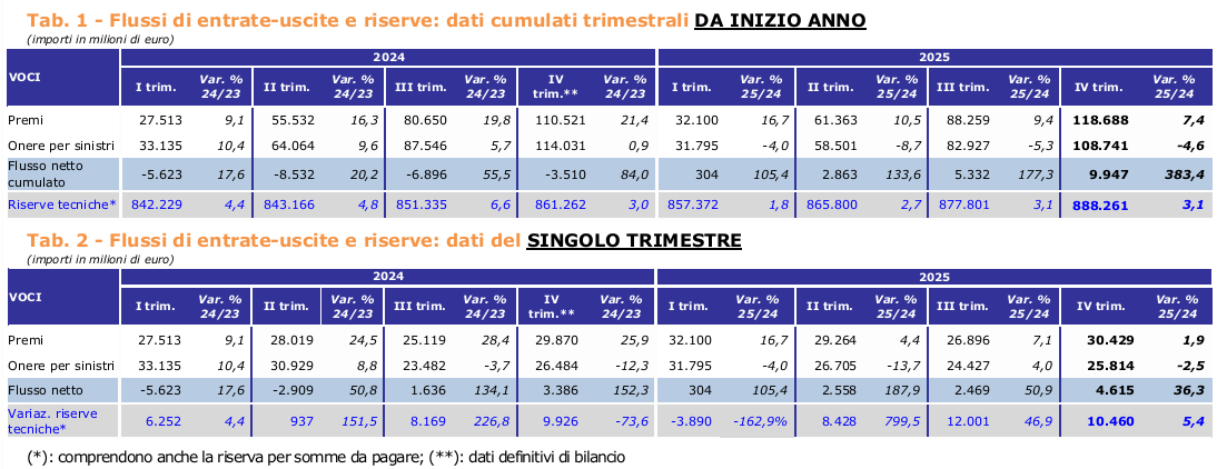 L’Associazione delle imprese analizza i dati anche per singolo ramo, evidenziando ​come il ramo I registri un flusso netto positivo di 5,2 miliardi (oltre 4 miliardi in più del 2024), grazie a premi sostanzialmente stabili a 73,8 miliardi (+0,5%) – per l’84% a premio unico – e a oneri in calo del 5,2% (68,6 miliardi), in cui i riscatti e altri rimborsi pesano per il 71%. Nel ramo III la raccolta netta torna positiva per 1,8 miliardi, dopo il saldo negativo di 5,3 miliardi del 2024: i premi salgono a 37,4 miliardi (+18,8%), ancora per l’84% a premio unico, mentre gli oneri si riducono del 3,1% a 35,7 miliardi, con riscatti e rimborsi pari all’84%. Le riserve del ramo I salgono di 9,1 miliardi a 567,4 miliardi, di cui 3,9 miliardi imputabili a rendimenti, mentre nel ramo III le riserve crescono di 13,5 miliardi fino a 269,7 miliardi, grazie a una rivalutazione degli attivi sottostanti di 11,7 miliardi su mercati finanziari favorevoli. Il ramo VI porta le riserve a 33,2 miliardi (+4,9 miliardi), anche per effetto di operazioni straordinarie di poche compagnie, mentre il ramo V scende a 16,9 miliardi, proseguendo la riduzione iniziata nel 2018.