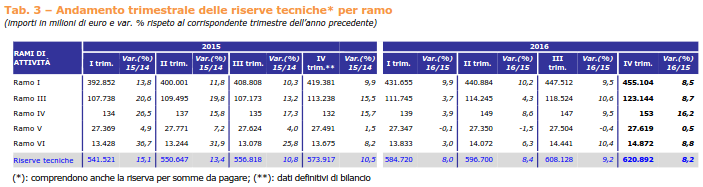 Le riserve tecniche vita alla fine dell’anno 2016 sono state pari a € 620,9 mld, in aumento del 2,1% rispetto al trimestre precedente e dell’8,2% rispetto al 2015, pressoché in linea con la crescita registrata nei trimestri precedenti (cfr. Tab. 1, Tab. 2 e Allegato IV). In particolare, il 73% delle riserve deriva da impegni assunti da polizze di ramo I (un punto percentuale in meno rispetto al trimestre precedente) mentre il 20% è afferente a