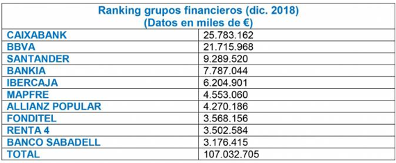 I primi 10 gruppi in classifica sono CaixaBank, BBVA, Santander, Bankia, Bankia, Ibercaja, Mapfre, Allianz Popular, Fonditel, Renta 4 e Banco Sabadell.