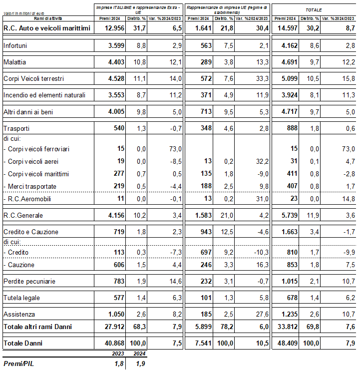 I premi contabilizzati nei rami Danni delle imprese nazionali ed extra-europee sono risultati in crescita del 7,5% rispetto al 2023 per un volume che ha sfiorato i 41 miliardi. Il risultato è stato determinato da un aumento dei premi del ramo R.C. Auto (+6,5%) e da una crescita significativa dei premi negli altri rami Danni (+7,9%).