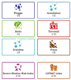 (Pioggia, Inondazioni, Vento, Terremoti, Grandine, Frane) e 2 indici di sintesi (il Severe Weather Risk Index e il CatNat Index).