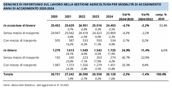 assicurativa Agricoltura dell’Inail, si chiude con un trend in calo, confermato anche dai dati provvisori del 2025. Il numero totale di denunce in complesso pervenute nell’anno 2024 e pari a 26.128, mostra infatti il decremento del 2,3% rispetto al 2020 (26.731) e del 1,6% rispetto al 2023 (26.558).