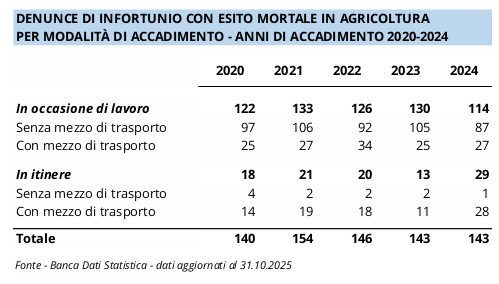 Nel quinquennio in esame l’agricoltura continua a confermarsi uno dei settori più rischiosi del sistema produttivo italiano, con una quota di infortuni mortali sul totale delle denunce quasi tripla rispetto a Industria e servizi (0,5% contro 0,2%). Il numero dei casi mortali resta mediamente stabile intorno ai 145 l’anno, ma cambiano le modalità di accadimento: crescono in modo anomalo gli infortuni in itinere, più che raddoppiati nell’ultimo anno, fenomeno particolarmente significativo in un comparto in cui spesso si abita sul luogo di lavoro e gli spostamenti dovrebbero essere limitati. L’aumento riguarda soprattutto i lavoratori dipendenti, in particolare quelli nati fuori dall’Unione europea, mentre gli autonomi mostrano una riduzione dei casi mortali.