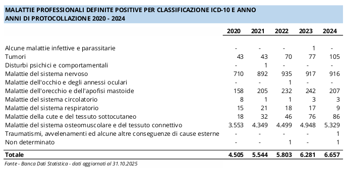 Il cuore del problema resta l’apparato muscolo-scheletrico: quasi otto malattie su dieci riguardano dorsopatie, tendiniti e disturbi dei tessuti molli legati a sforzi ripetuti, posture incongrue, movimentazione di carichi e uso di macchine vibranti, cui si aggiungono sindromi da sovraccarico (come il tunnel carpale), ipoacusie da rumore e dermatopatie e tumori cutanei per l’esposizione a prodotti chimici e raggi solari.