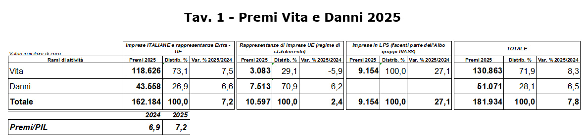 Le sole imprese di assicurazione nazionali e alle rappresentanze per l’Italia di imprese extra-europee hanno raccolto 162 miliardi di premi, in aumento del 7,2% rispetto al 2024 (Danni +6,6% e Vita +7,5%). L’incidenza dei premi totali sul PIL è cresciuta al 7,2% (era 6,9% nel 2024).