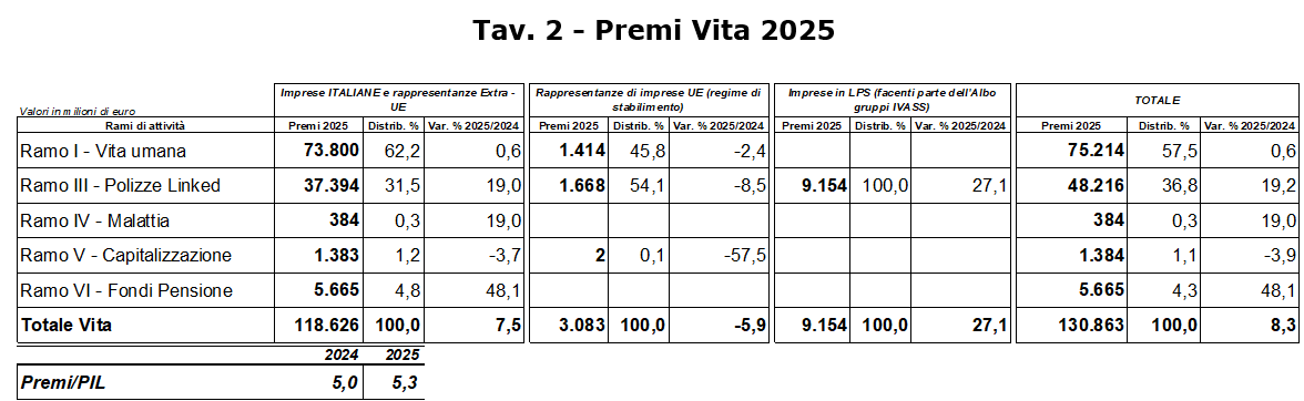 L’incidenza della raccolta Vita totale sul Prodotto Interno Lordo è risultata in aumento ed è stata pari al 5,3% nel 2025 (era 5,0% nel 2024).
