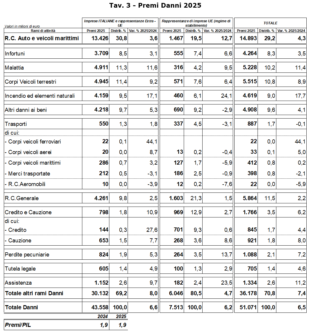 L’incidenza della raccolta Danni totale sul Prodotto Interno Lordo nel 2025 è risultata stabile e pari all’1,9% come nel 2024.