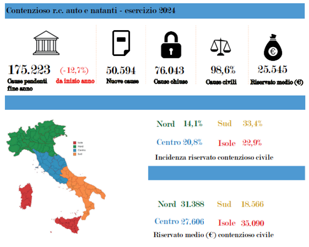 Il primo elemento è la sproporzione delle cause pendenti a fine esercizio, che si riflette anche nelle nuove cause promosse nell’anno. Eppure, se si osserva il parco veicolare 2024 (fonte ACI – Open Parco Veicoli), i numeri non giustificano tali divari: