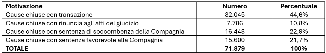 La rilevazione IVASS sul contenzioso civile di primo grado, per quanto riguarda la motivazione della chiusura della vertenza, presenta questi dati per il totale Italia: