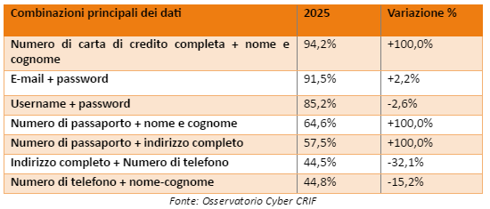 Tra le combinazioni di dati più esposte figurano quelle che facilitano in modo diretto le frodi finanziarie e il furto d’identità: nel 94,2% dei casi le informazioni sulle carte di credito compaiono insieme a nome e cognome, mentre e-mail e password sono associate nel 91,5% dei casi e, molto spesso, anche alla username, con un rischio elevatissimo di furto di account. Anche indirizzi completi, numeri di telefono e numeri di passaporto combinati con dati identificativi personali sono sempre più presenti e alimentano scenari di impersonificazione e profiling avanzato.