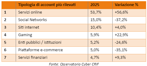 Sul fronte dei servizi colpiti, oltre alla posta elettronica spiccano gli account relativi a servizi online (53,7%), social network, siti internet, gaming, enti pubblici, e-commerce e servizi finanziari, evidenziando l’ampiezza della superficie d’attacco.