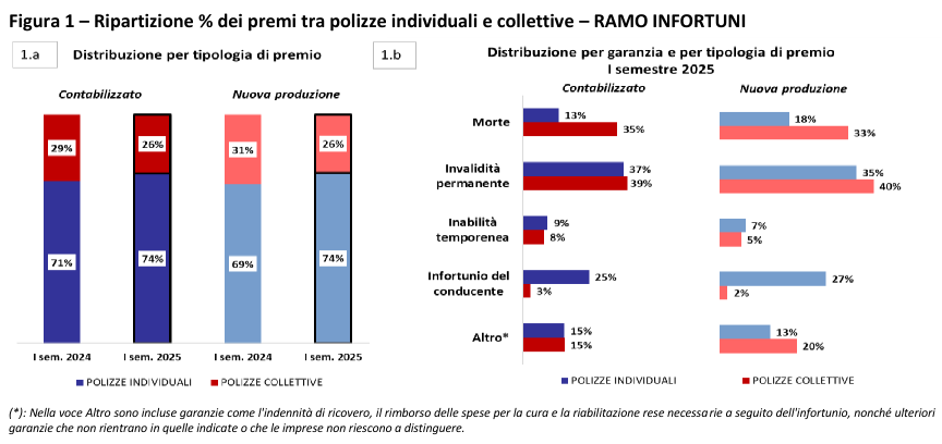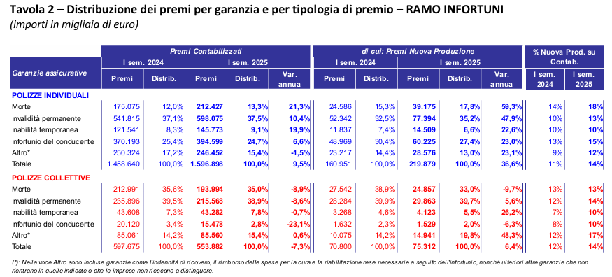 Per le polizze individuali (circa 14,2 milioni di contratti, +12,7%), oltre il 60% dei premi riguarda le garanzie invalidità permanente (37,5%, 598 milioni, +10,4%) e infortunio del conducente (24,7%, 395 milioni, +6,6%). Significative crescite si registrano per morte (13,3%, 212 milioni, +21,3%) e inabilità temporanea (9,1%, 146 milioni, +19,9%), mentre la “nuova produzione” incide per il 14% del totale (+36,6%).