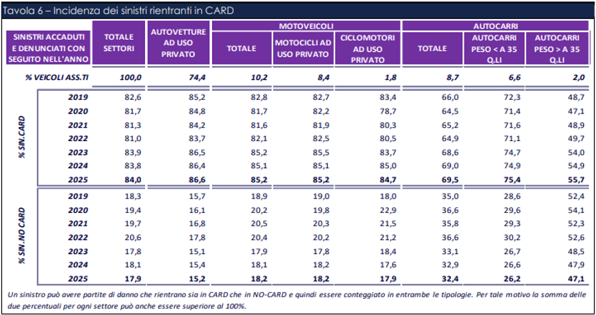 Il secondo riguarda invece il settore Autocarri, che conferma la sua controtendenza “storica”: per i veicoli con massa superiore a 35 q.li la quota di sinistri CARD arriva solo al 55,7%, segnalando una dinamica del tutto diversa rispetto al resto del mercato. Questo dato va letto insieme a un passaggio rilevante dell’Executive Summary, dove si precisa che, nonostante l’elevata incidenza del numero di sinistri che confluiscono nella gestione CARD, questi generalmente non arrivano a coprire il 50% degli oneri complessivi dei risarcimenti R.C. Auto. La differenza è spiegabile con l’esclusione dalla procedura di risarcimento diretto della maggior parte dei sinistri con danni gravi alla persona, i cui importi risultano molto elevati. Ne deriva che, soprattutto nei comparti in cui la quota di sinistri che transitano in CARD è più bassa – come quello degli autocarri pesanti – il peso economico dei sinistri gestiti al di fuori del risarcimento diretto rimane particolarmente rilevante.