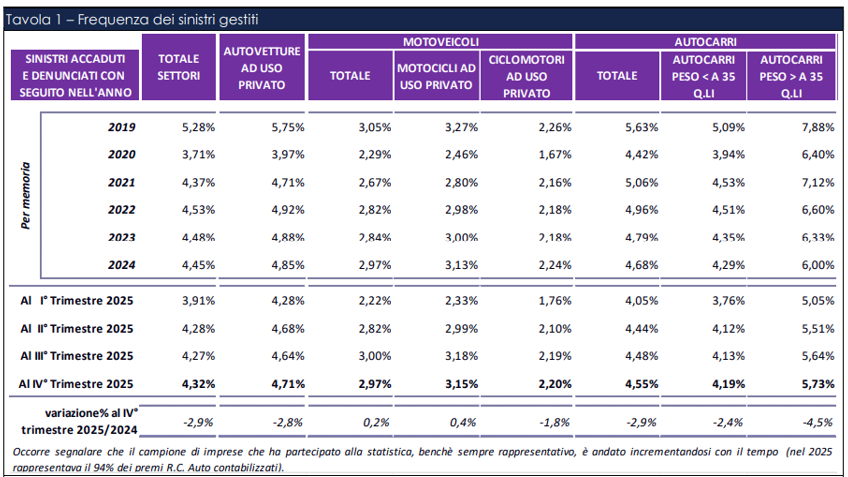 La tavola sulla frequenza indica per il 2025 una tendenza al ribasso per il totale dei veicoli; la frequenza per il totale dei settori si è attestata al 4,32%, in riduzione del 2,9% rispetto al 2024 (4,45%).