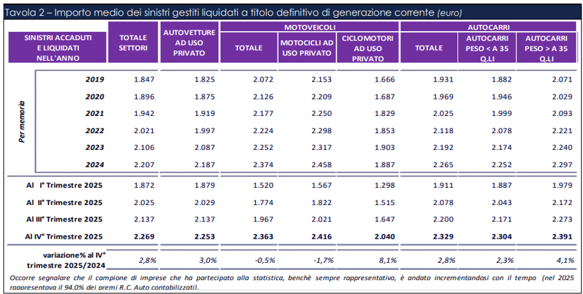 ANIA presenta due tavole particolarmente significative. In sintesi, l’importo medio dei sinistri accaduti e liquidati nel 2025 (cosiddetti “sinistri gestiti di generazione corrente”) è stato pari a € 2.269, in aumento del +2,8% rispetto al 2024 quando era pari a € 2.207.