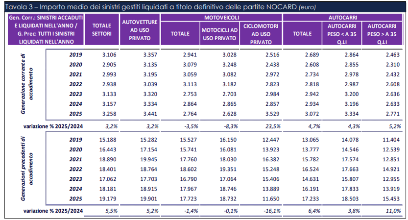 Se si legge, invece, la tavola degli importi dei sinistri gestiti NO CARD, anno di accadimento, occorre evidenziare che nel 2025 la percentuale aumenta del 3,2% per il totale dei settori e anche per le autovetture ad uso privato (+3,2%). Tra i motoveicoli il quadro è eterogeneo: i motocicli mostrano una flessione dell’8,3%, mentre i ciclomotori registrano un forte incremento (+23,5%). Gli autocarri evidenziano aumenti diffusi (+4,7% complessivo), più marcati per i mezzi oltre i 35 quintali (+5,2%).