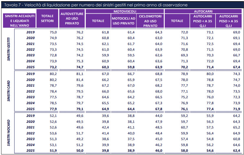La velocità di liquidazione, cioè i sinistri che sono stati definitivamente liquidati nel primo anno di osservazione, è in diminuzione (2024: 73,9% – 2025: 73,2%). Il dato è abbastanza generalizzato e richiederebbe un approfondimento. Per i sinistri CARD, nel settore autovetture la diminuzione dal 2019 al 2025 è di due punti percentuali, mentre nei sinistri NO CARD (che dovrebbero presentare una maggiore complessità) l’andamento è molto più variabile. Andrebbe inoltre verificato quanto pesi l’efficienza organizzativa degli uffici sinistri nel determinare questi risultati.
