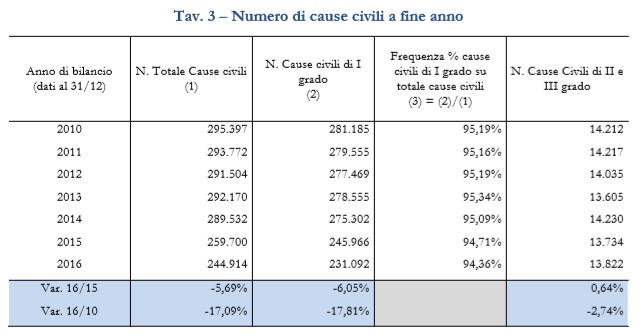 Le cause civili chiuse nel 2016 sono 156.885 e superano le nuove aperture, pari a 143.845. Sono state chiuse il 41% delle cause gestite (pendenti ad inizio anno più aperte nell’anno) presso Giudici di Pace e il 29% presso Tribunali nonché il 25% delle cause di II grado.