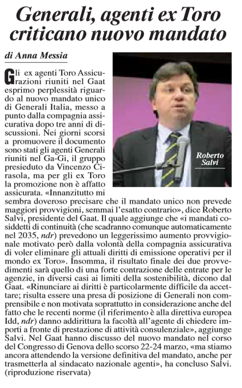 Gli ex agenti Toro Assicurazioni riuniti nel Gaat esprimo perplessità riguardo al nuovo mandato unico di Generali Italia, messo a punto dalla compagnia assicurativa dopo tre anni di discussioni. Nei giorni scorsi a promuovere il documento sono stati gli agenti Generali riuniti nel Ga-Gi, il gruppo presieduto da Vincenzo Cirasola, ma per gli ex Toro la promozione non è affatto assicurata. «Innanzitutto mi sembra doveroso precisare che il mandato unico non prevede maggiori provvigioni, semmai l’esatto contrario», dice Roberto Salvi, presidente del Gaat. Il quale aggiunge che «i mandati cosiddetti di continuità (che scadranno comunque automaticamente nel 2035, ndr) prevedono un leggerissimo aumento provvigionale motivato però dalla volontà della compagnia assicurativa di voler eliminare gli attuali diritti di emissione operativi per il mondo ex Toro».
