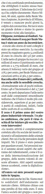 Il dg Filippone: «I risultati economici si affiancano a una confermata solidità. Solvency ratio al 276 per cento». L’assemblea che domani a Torino chiuderà l’esercizio 192 di Reale Mutua assicurazione si annuncia ben lontana da toni trionfalistici. «Ci troviamo a chiudere un anno che per molti versi è stato entusiasmante – dice Luca Filip-pone, direttore generale di Reale Mu-tua —. Eppure quel 31 dicembre 2019 oggi appare lontanissimo, siamo immersi in una realtà diversa e inattesa, che ci sta cambiando profondamente, che obbligherà il nostro business a cambiare».