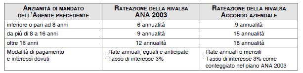 Come prima precisato, trattandosi di un importo a volte importante il versamento dell’importo della rivalsa può essere effettuato dall’agente subentrante in rate annuali comprensive dell’interesse del 3% annuo con la seguente modalità, secondo l’accordo Ana 2003: