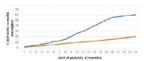 La caratteristica di questa indennità è la curva della sua crescita a parità di compensi provvigionali. La curva, che viene generata esclusivamente dall’anzianità di mandato, è rappresentata con il seguente grafico: