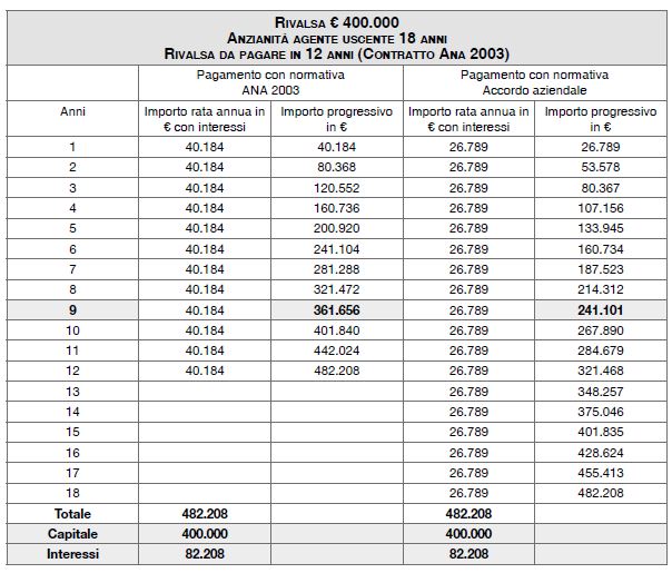 Vediamo quindi cosa succede, in termini economici, nel caso di cessazione dell’incarico al 9°anno, nelle due differenti realtà in relazione alla scelta iniziale dell’agente, al momento del conferimento del mandato, di pagare la rivalsa in 12 anni, secondo l’Ana 2003 o in 18 anni in base ad un Accordo aziendale (o a una sempre possibile singola trattativa).