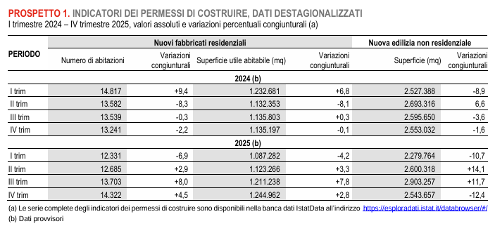 Nel complesso, il report restituisce l’immagine di un 2025 in cui la nuova edilizia residenziale, pur chiudendo l’anno in crescita, non recupera completamente i livelli del 2024 in termini di numero di abitazioni, mentre il non residenziale esce da una fase di espansione pluriennale e mostra i primi segnali di arretramento, confermando la funzione di questi indicatori come anticipatori del ciclo edilizio e degli investimenti in costruzioni.