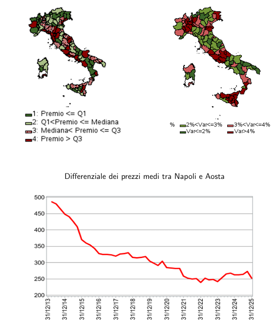 Permane in ogni caso un importante divario territoriale: a Napoli il premio medio è superiore di 252 euro rispetto ad Aosta. Il differenziale è stabile rispetto al quarto trimestre del 2024 e si riduce rispetto al 2012 del 50,4%.
