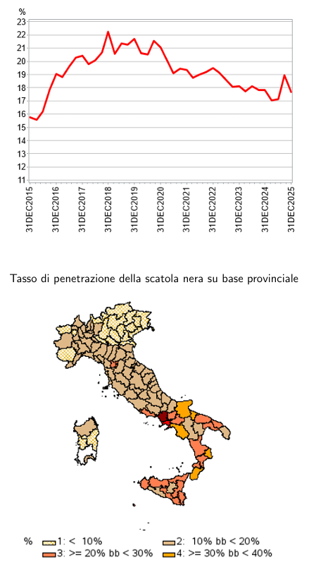 Per quanto riguarda la scatola nera, il tasso di penetrazione resta stabile e pari al 17,7%. Emerge una elevata diffusione di contratti con scatola nera in alcune province del Sud, tra cui Caserta (59,5%) e Napoli (48,1%).