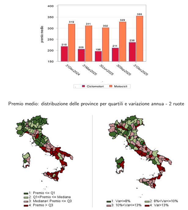 Per quanto riguarda i motocicli il prezzo medio è di 355 € per i motocicli (+11,3%), mentre sale a 236 € per i ciclomotori, con un aumento dell’8,6%.